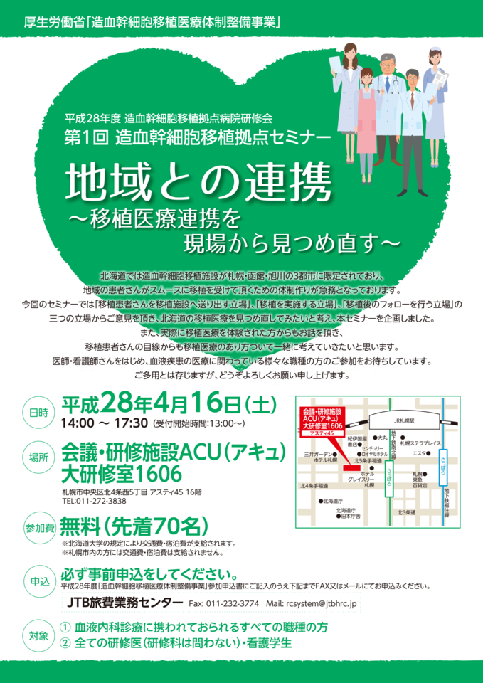 平成28年度第1回 造血幹細胞移植拠点セミナーのお知らせ