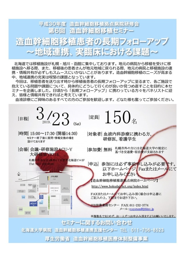2019年3月23日(土) に、会議・研修施設ACU-Y 大研修室Y0313にて、平成30年度第6回造血幹細胞移植セミナーを開催致します。